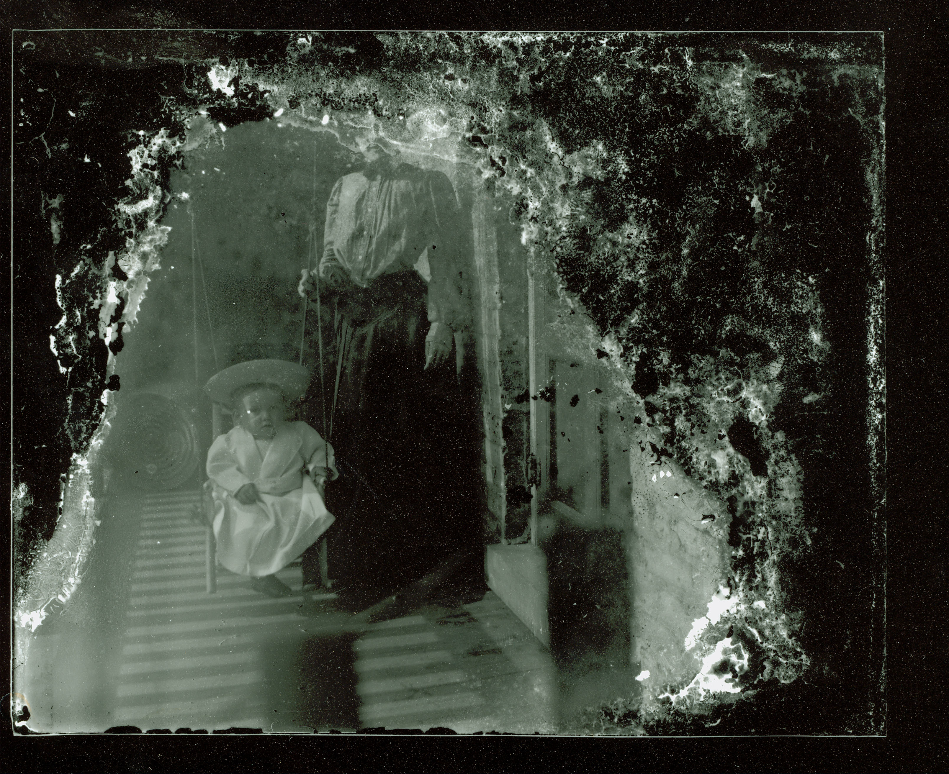 photograph of an unidentified woman with a baby in a swing