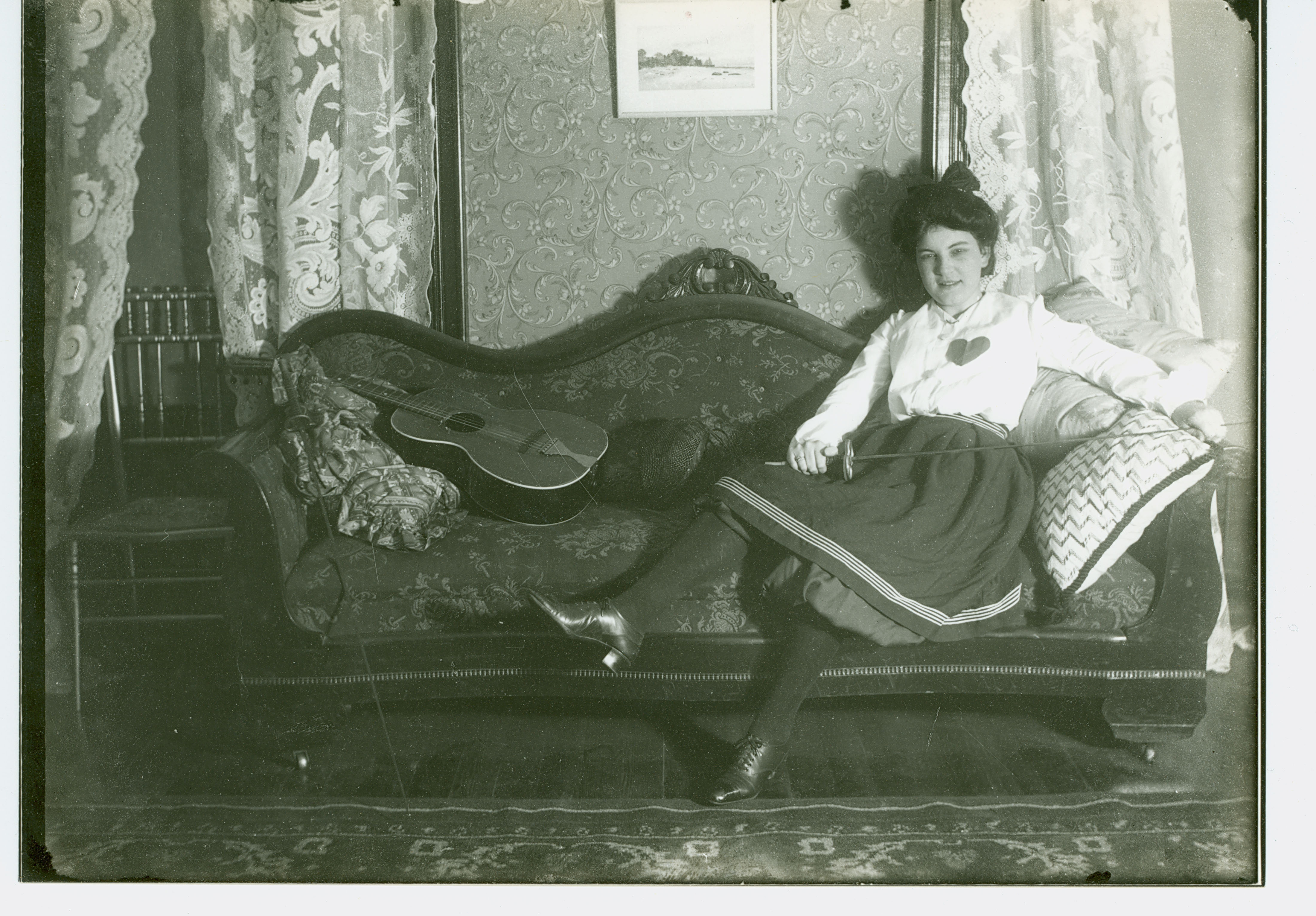 woman on couch with a guitar and fencing sword (Series I, Item 45)