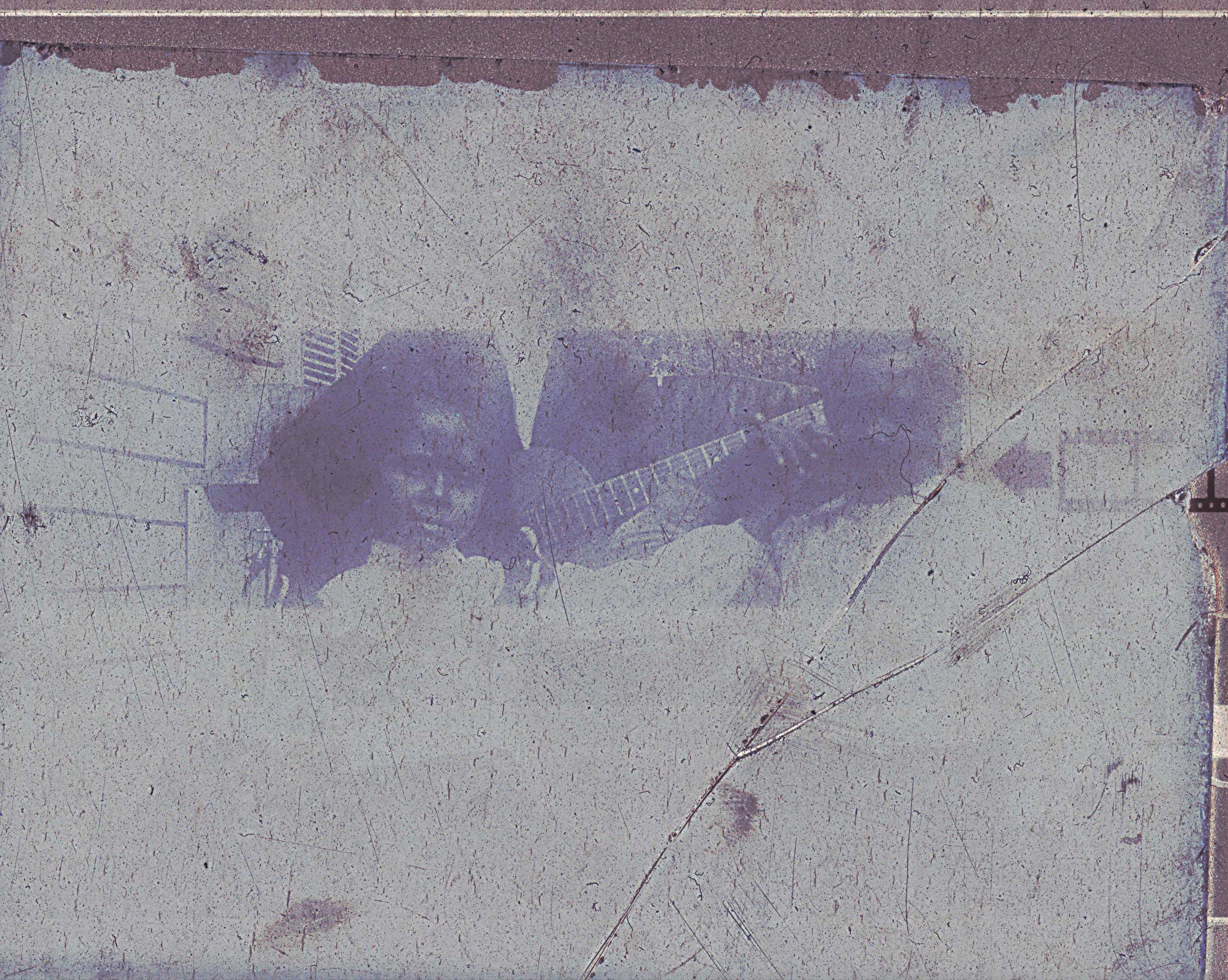 three African American children with a guitar on a porch. (Series I, Item 95)