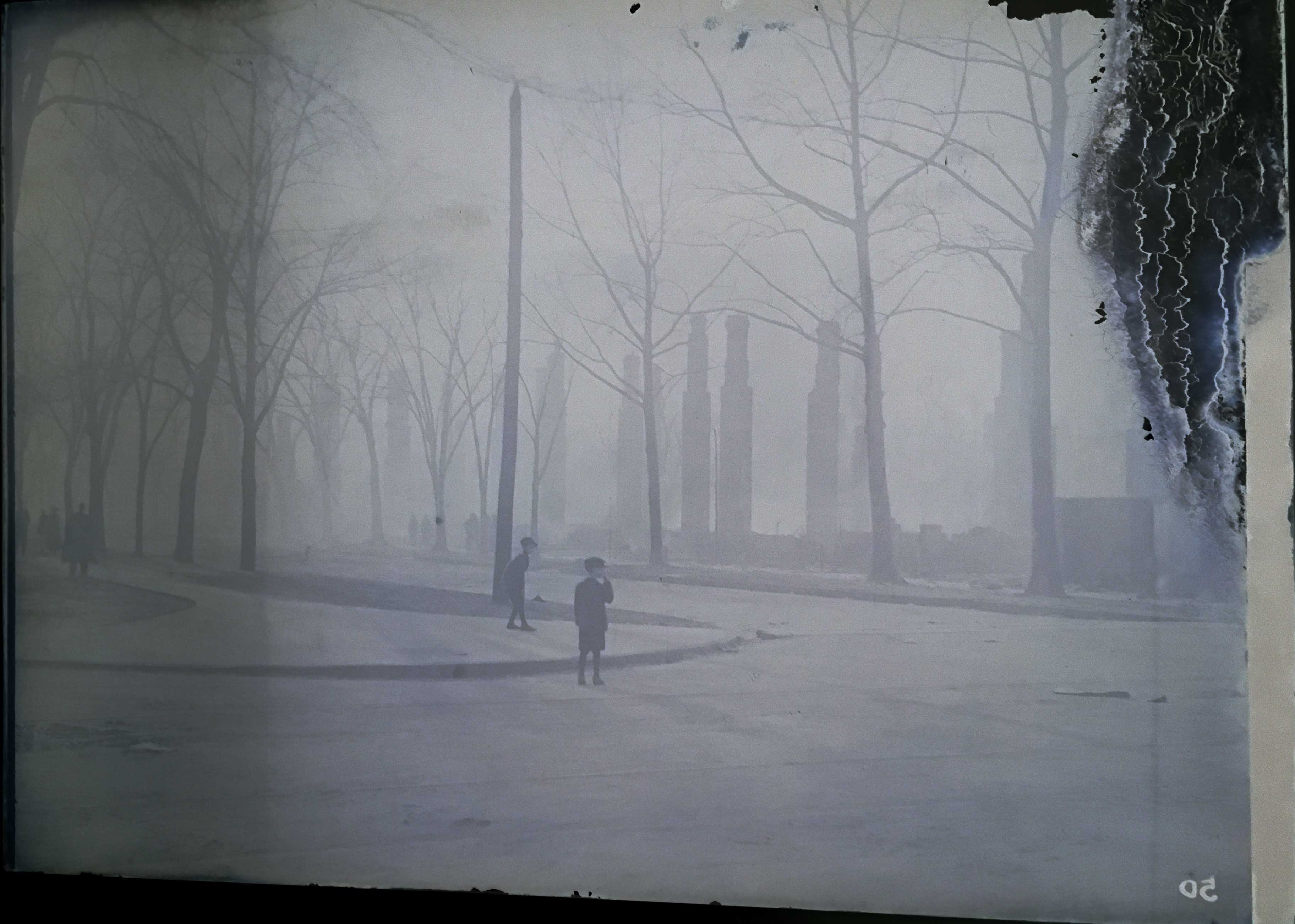 Photograph of Augusta street following a fire (most likely the fire of 1916). This photograph depicts two children on an empty street, eith dead trees and the chimneys left standing after the buildings on the street have burned down.