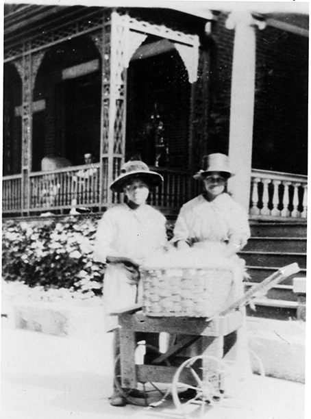 Photograph depicting two women with a cart