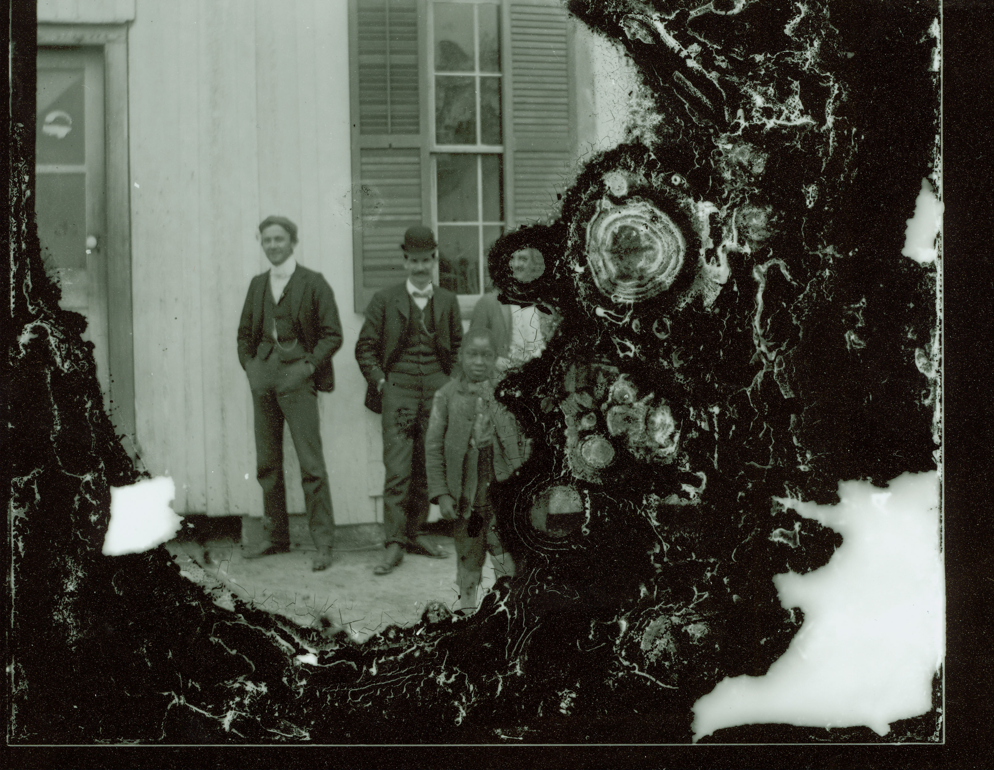 Photograph of unidentified group, including three adult white men, and an African American child in front of a building.