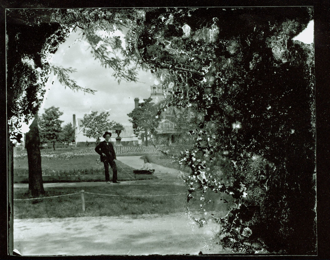 Photograph of an unidentified man on the street, pulling a baby in a cart, with a building in the background