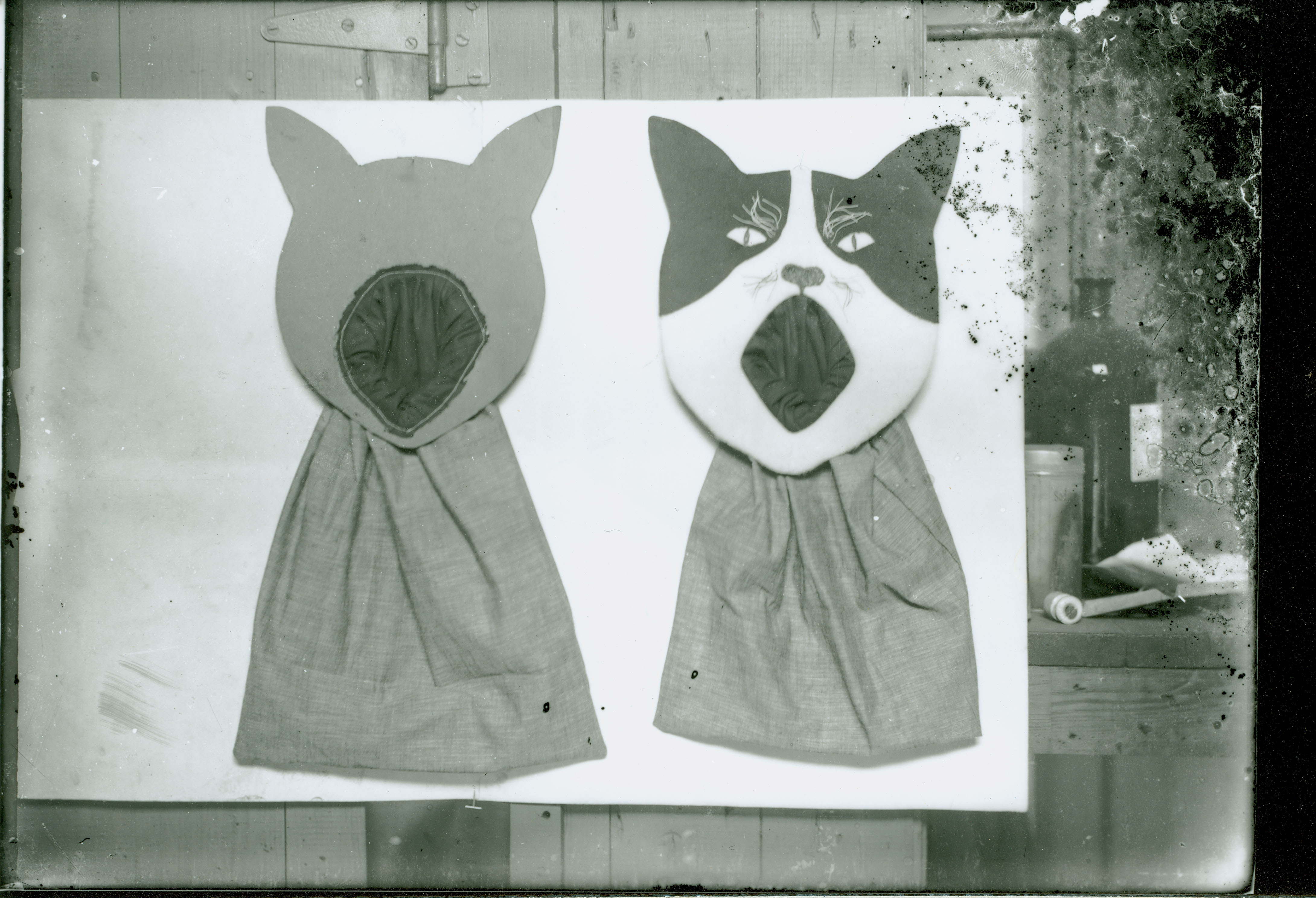 Photograph of cat masks/cat bags made out of fabric, hanging on a door