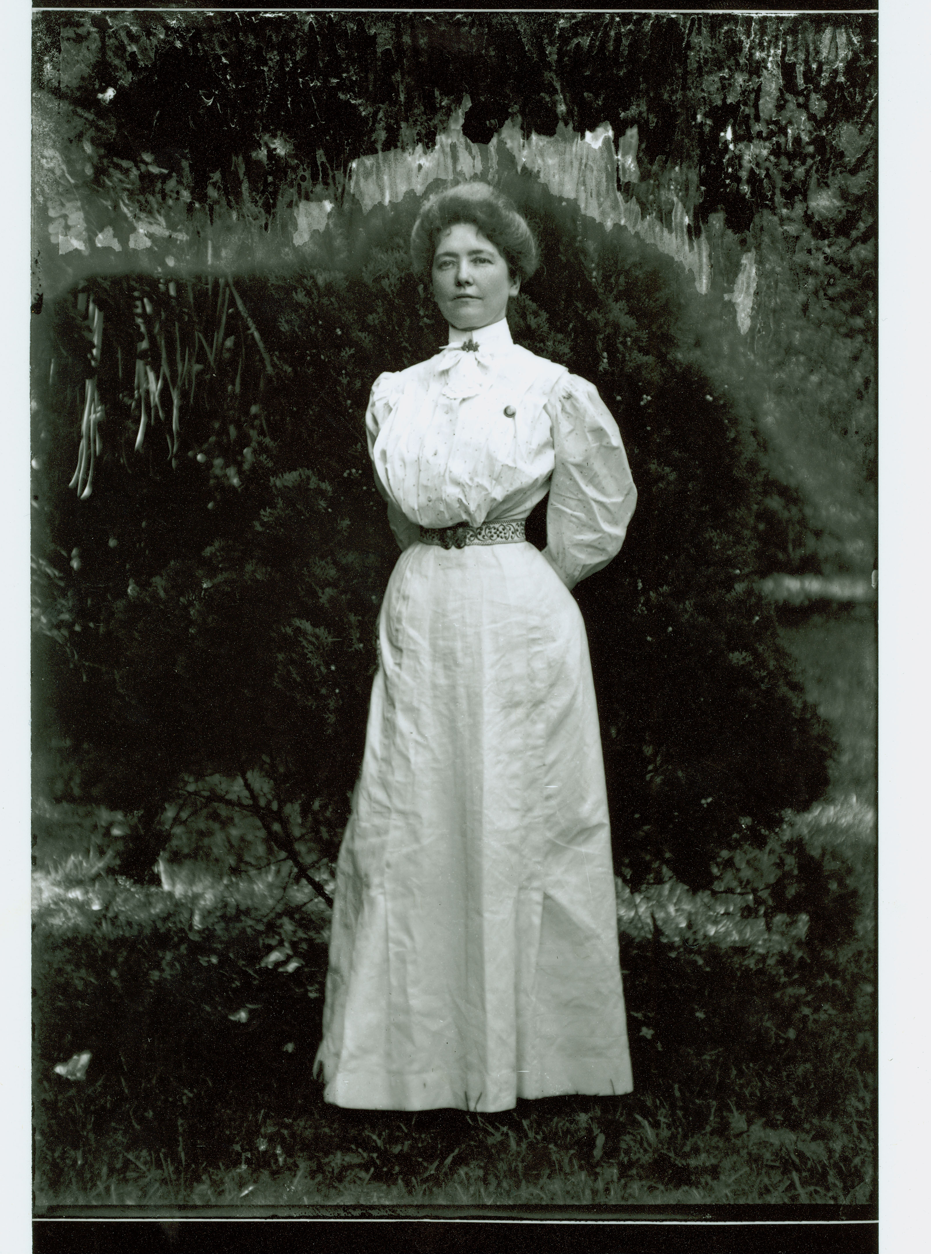 Photograph of an unidentified woman in a white dress, standing outside in front of bushes